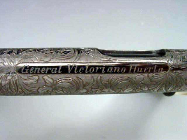 finish, checkered pearl grips, engraved, with inscription General Victoriano Huerta on