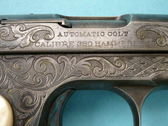 Serial no. 4684, .380 ACP, blued, with pearl grips. Profuse engraving by Cuno