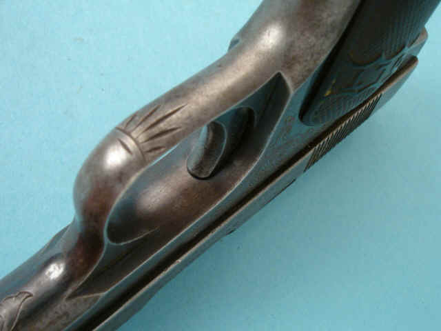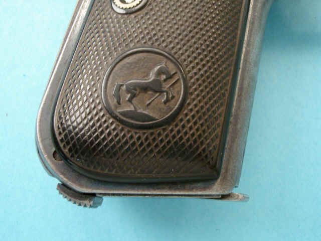 Serial no. 119950, .32 ACP, blued, with checkered hard rubber grips. Light scroll and border engraving by Cuno Helfricht.