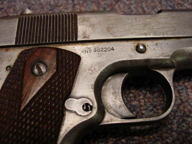 Serial no. 382204, .45 caliber, 5 inch barrel. Checkered walnut grips.