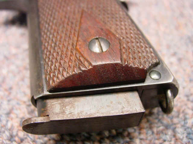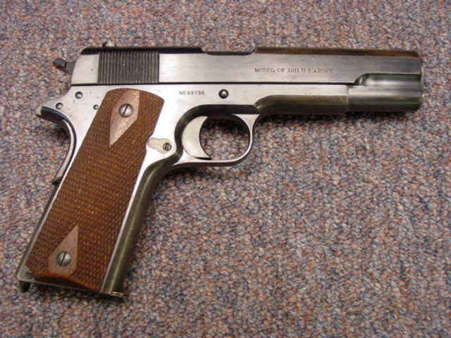 Serial no. 69738, .45 caliber, 5 inch barel. Blued finish. Checkered walnut grips.