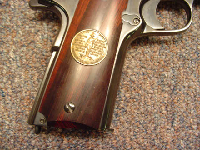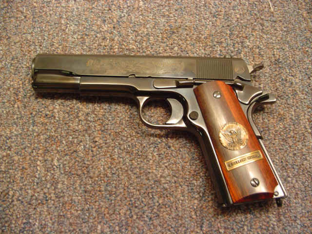Serial no. 3248-BW, .45ACP caliber, 5-inch barrel, standard markings, finishes and grips with commemorative medallions and inlays.