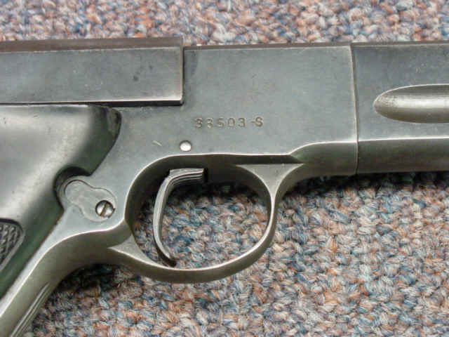 Serial no. 38503-S, .22 long rifle caliber, 6-inch barrel, blued, with checkered black