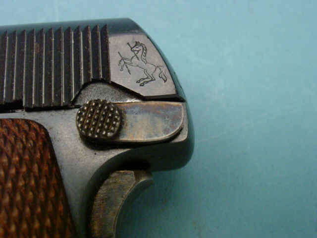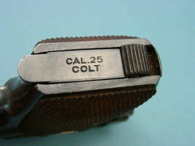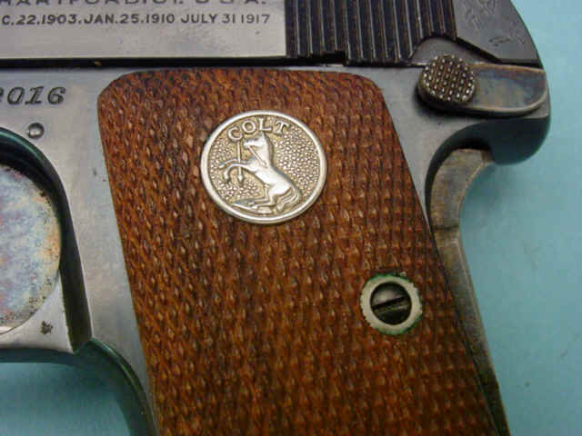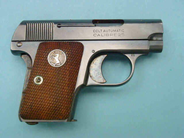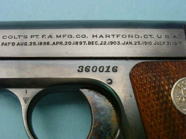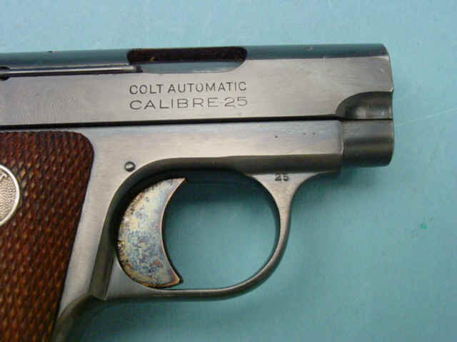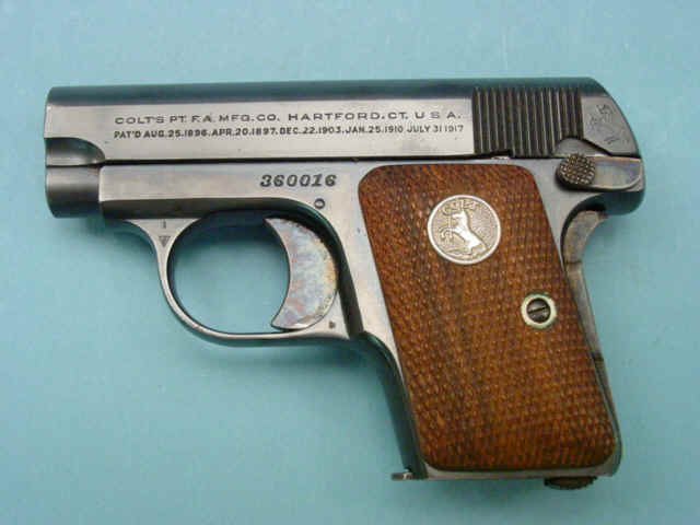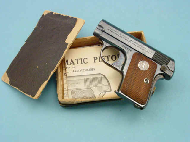 Serial no. 360016, .25 caliber, 2-inch barrel. Blued finish. Checkered walnut grips with medallions. Case-hardened trigger and grip safety. Contained in original factory box together with factory literature.
