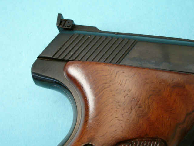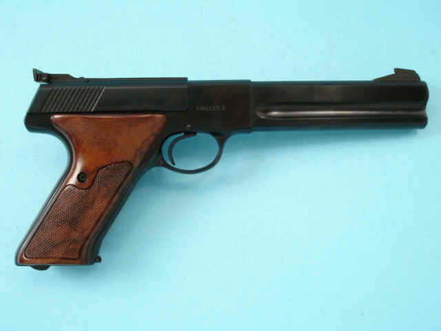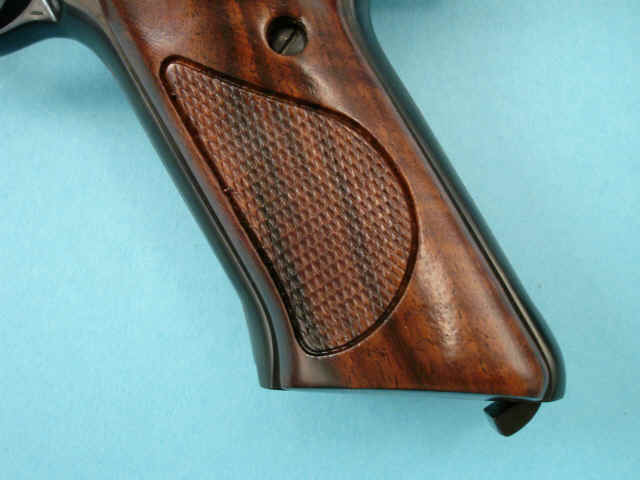 Serial no. 086215 S, .22 long rifle, 6-inch barrel, standard markings; blued; checkered thumbrest walnut grips. Box with brochures.
