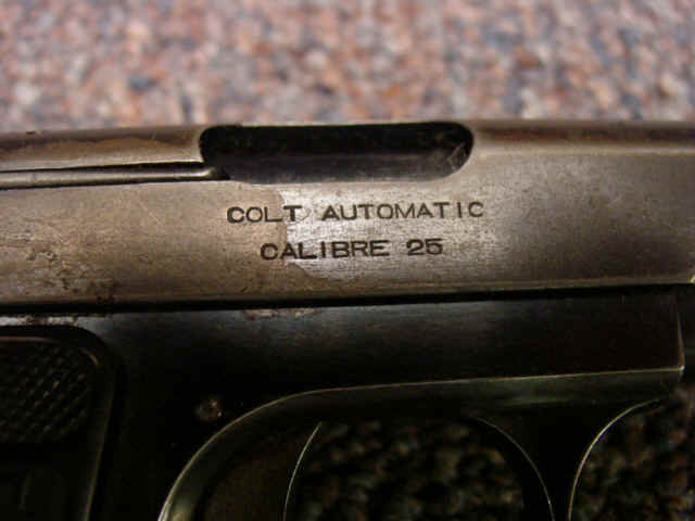 Serial no. 118163, .25 caliber, 2 inch barrel. Blued finish. Hard rubber Colt grips.