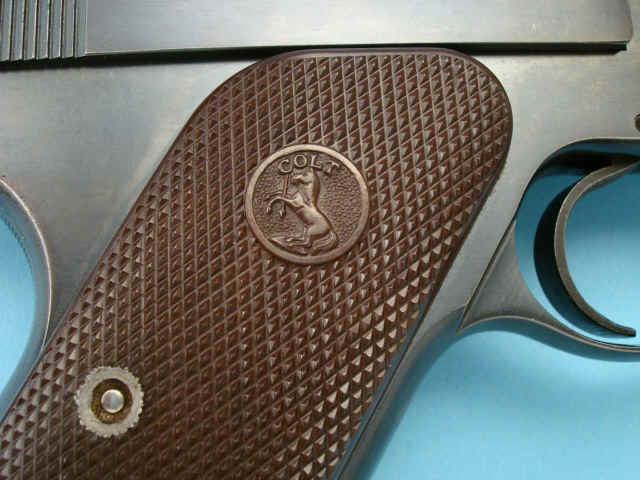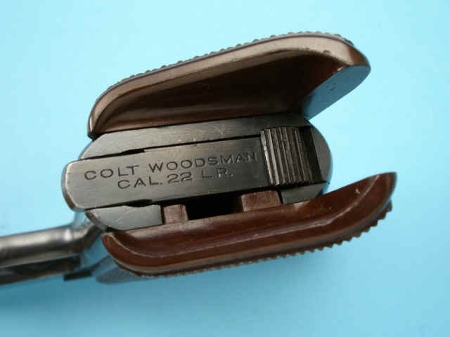 Serial no. 181279, .22 LR caliber, 6 5/8-inch barrel. Blue finish and checked brown "Coltwood" plastic factory grips. with extended bottoms. Magazine marked: COLT WOODSMAN CAL 22 LR.