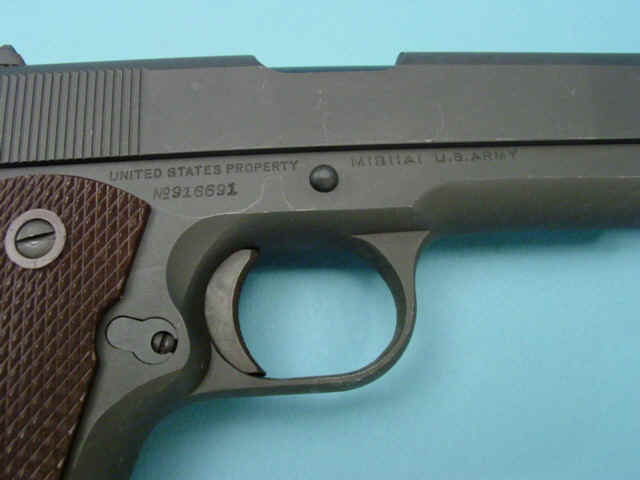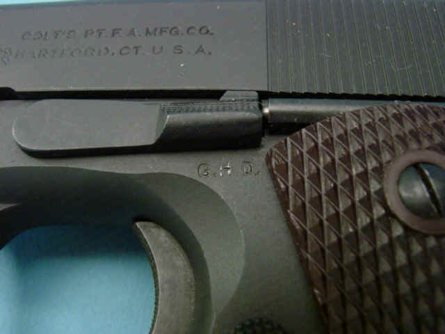 Serial no. 916691, .45ACP caliber, 5-inch barrel, G.H.D. inspector marking on left side of frame; Parkerized finish; checkered composition grips.