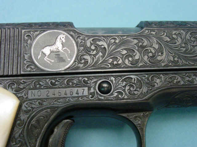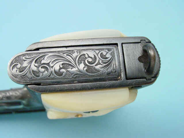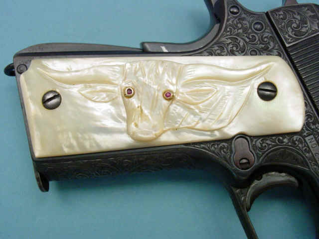 Serial no. 2454647, .45 caliber, 5-inch barrel. Finely scroll-engraved throughout with silver-inlaid medallions having rampant Colt motifs. Knurled trigger. Blued finish. Carved steerhead pearl grips, the right side with gold and ruby eyes.