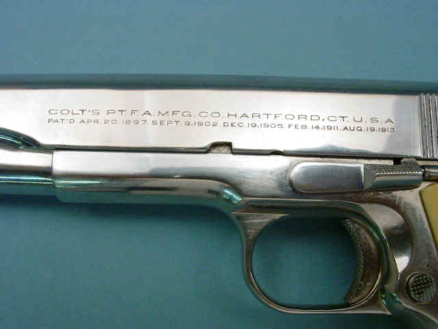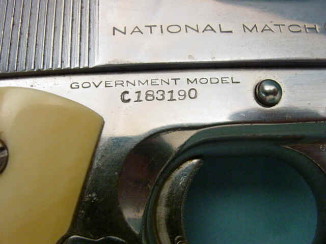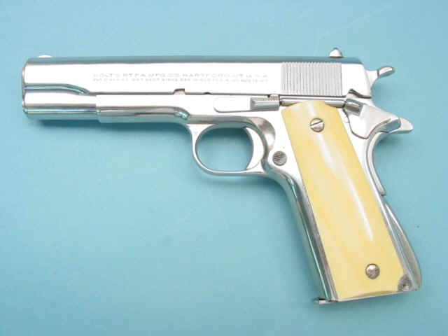 Serial no. C183190, .45 caliber, 5-inch barrel. Nickel-plated finish. Ivory grips.
