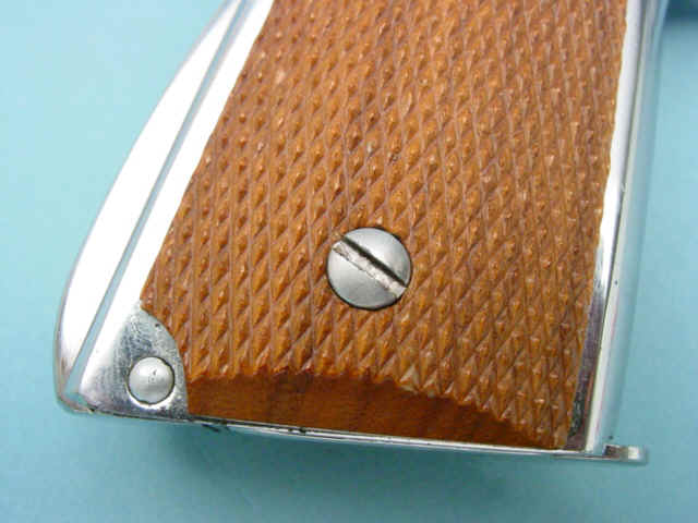Serial no. 202184, .38 caliber, 5-inch barrel. Nickel-plated finish. Checkered walnut grips with medallions.