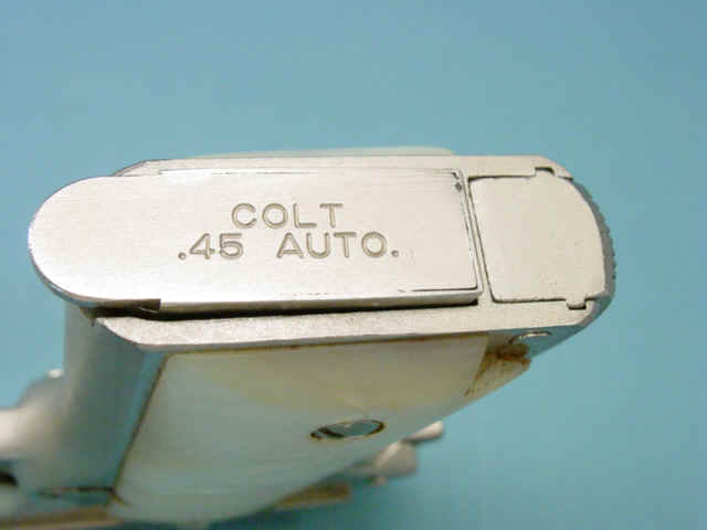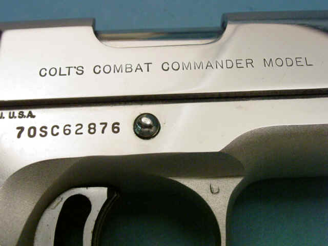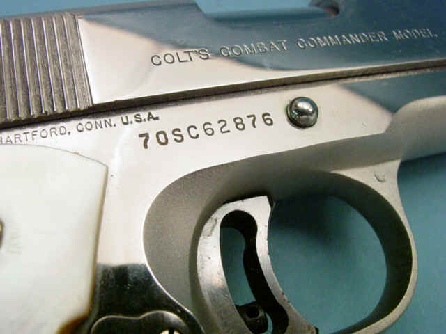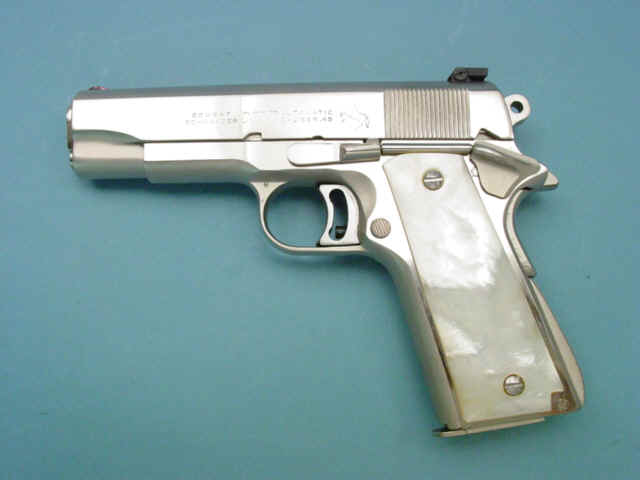 Serial no. 70SC62876, .45 caliber, 4-inch barrel with luinous front sight and adjustable rear sight. Nickel-plated finish. Adjustable trigger. Pearl grips.