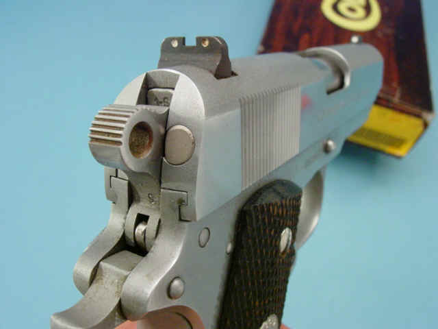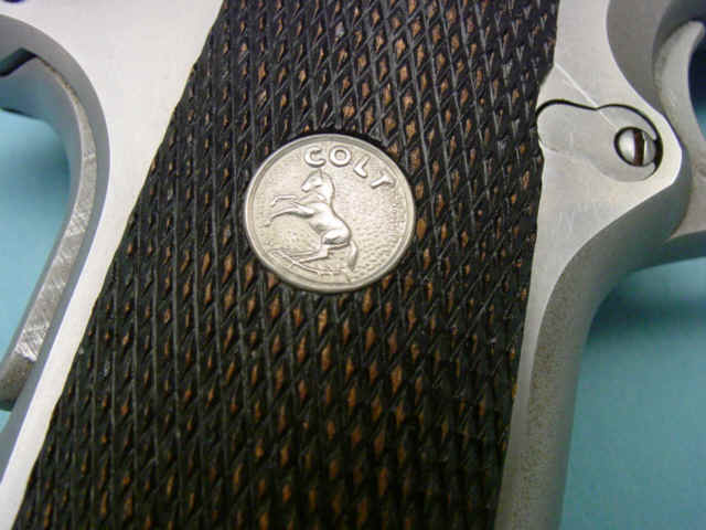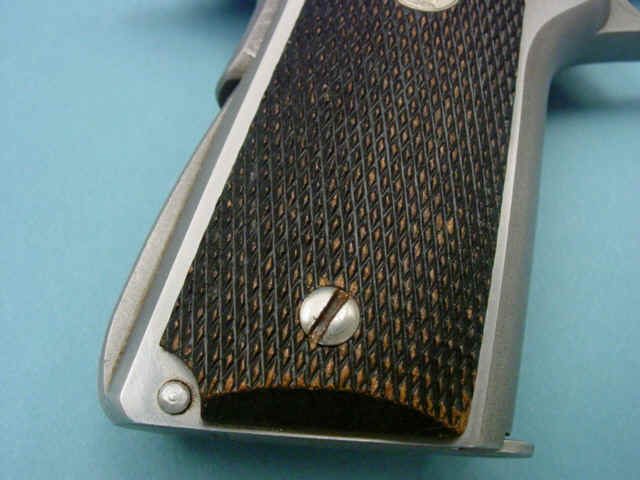 Serial no. SS15636, .45 caliber, 3 1/2-inch barrel. Stainless steel construction. Checkered walnut grips with medallions. Contained in factory box with accompanying literature.