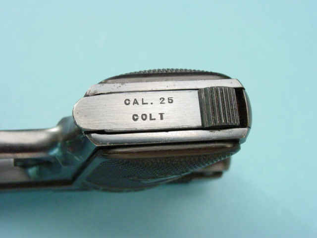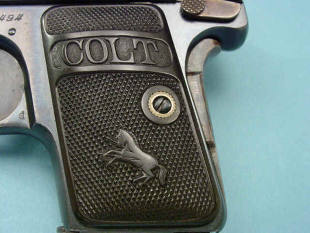 Serial no. 132494, .25 caliber, 2-inch barrel. Blued finish. Case-hardened trigger and grip safety. Colt hard rubber grips.