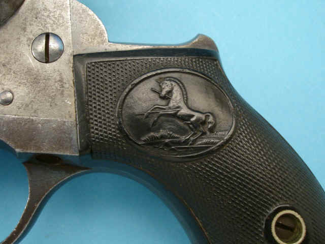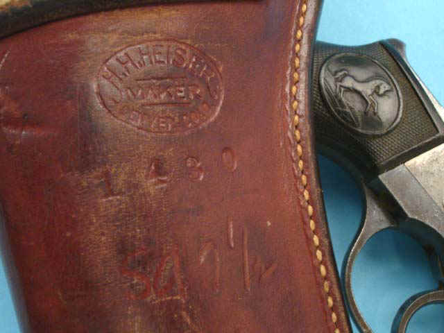 Hard rubber grips. Contained in a vintage brown leather holster by H.H.Heiser.