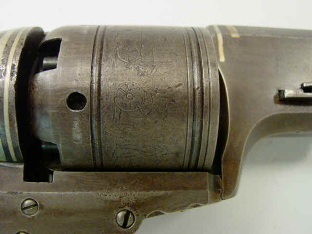 Serial no. 148, .36 caliber, 5-shot cylinder with stagecoach holdup cylinder roll