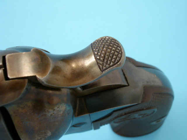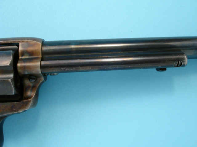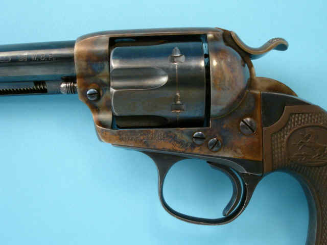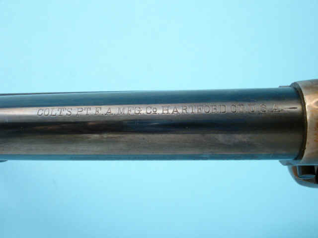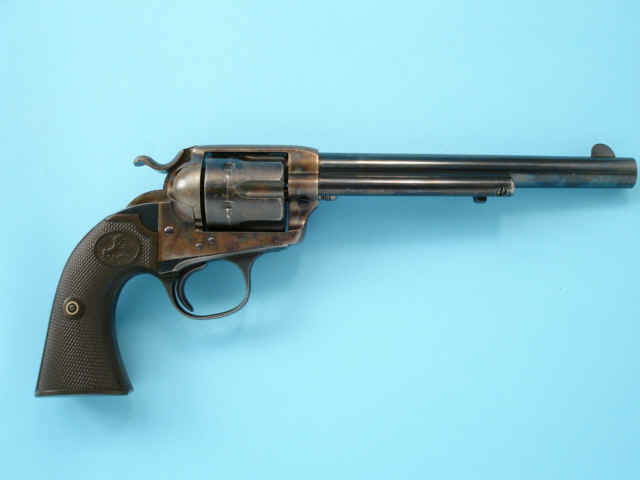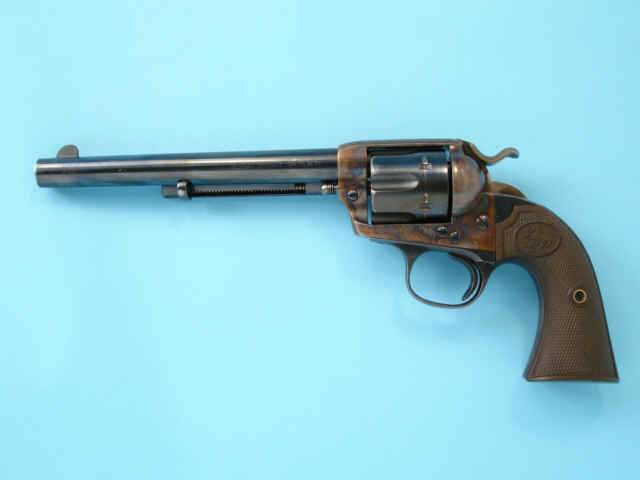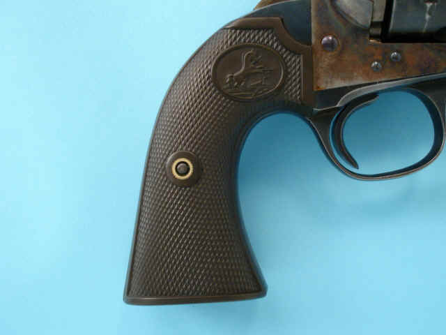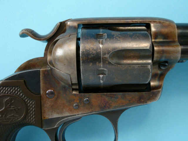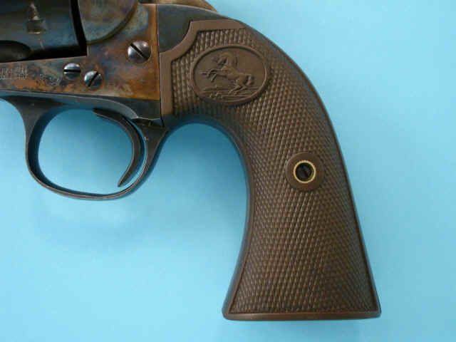 case-hardened; checkered hard rubber Colt medallion grips.