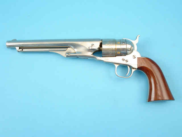nickel-plated finish; varnished walnut grips.