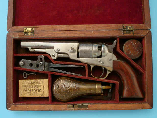 lined in burgundy velvet, with eagle and shield powder flask, steel COLTS/PATENT bullet