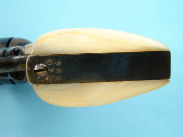 primarily on left recoil shield; cylinder with tracking lines; grips fine, with some