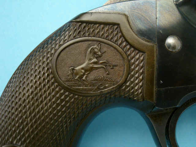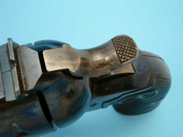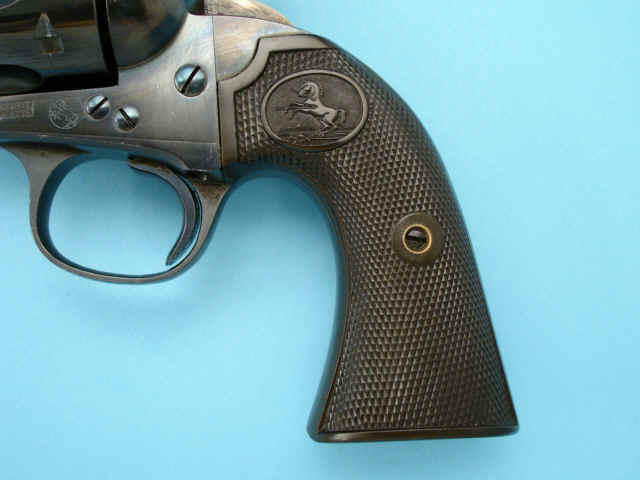 logo in circle to right; blued, with case-hardened hammer; checkered hard rubber grips.