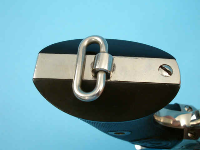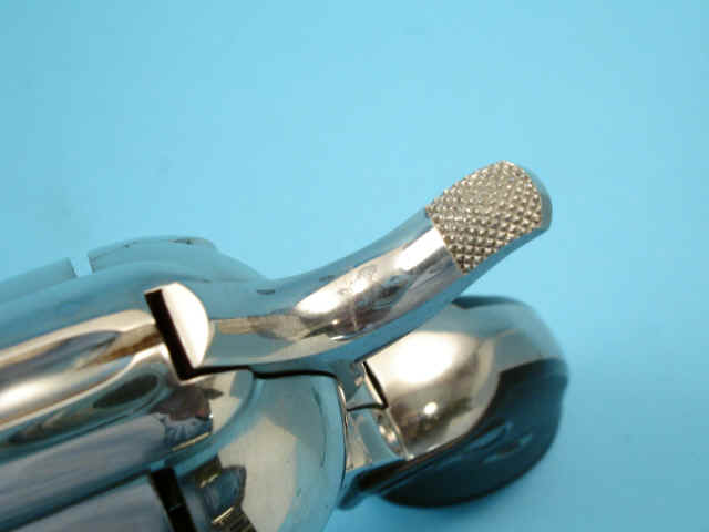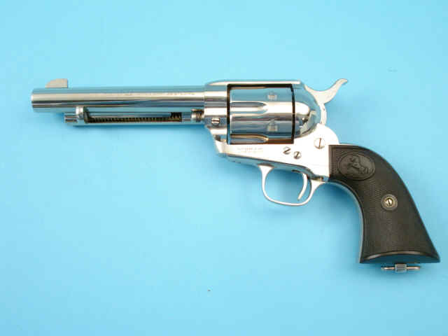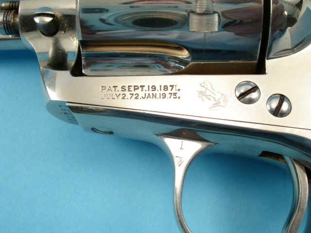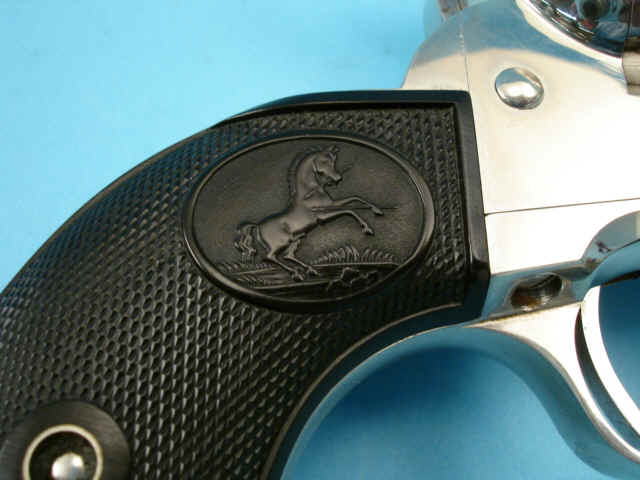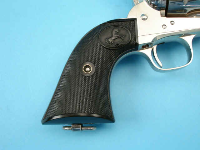 rampant colt logo; nickel-plated finish; checkered hard rubber grips; lanyard swivel