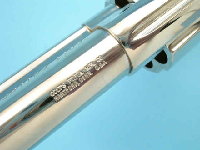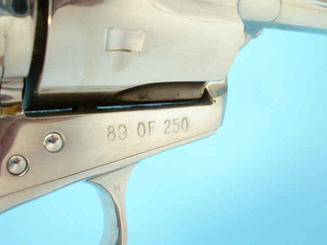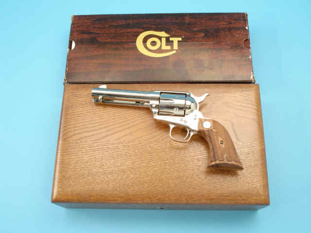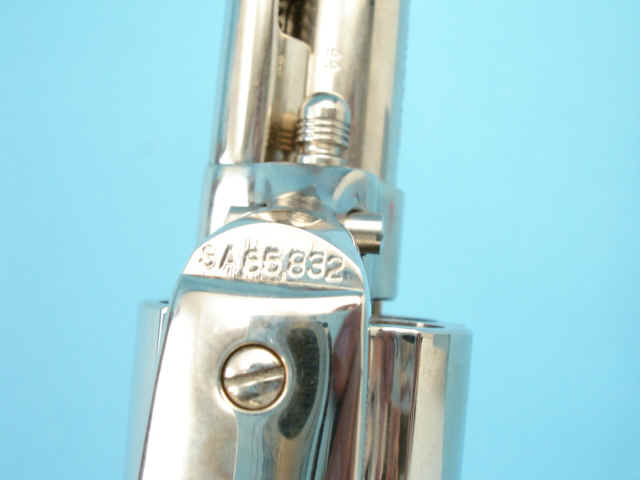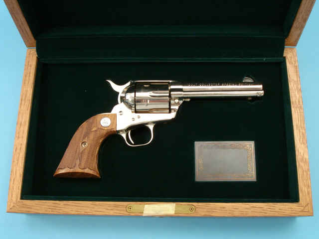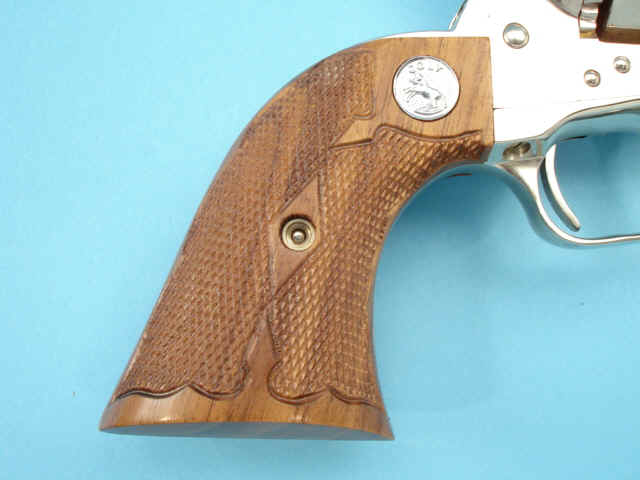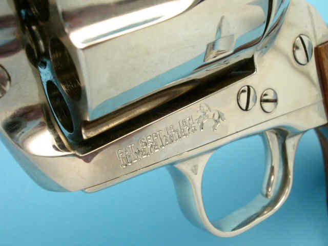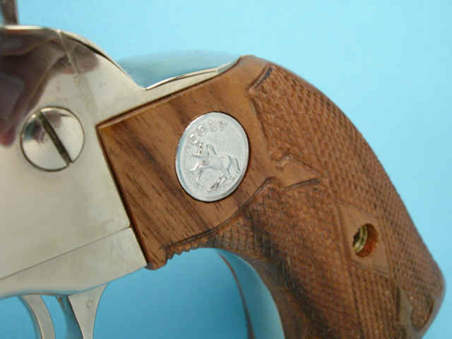 250"; nickel-plated; checkered walnut grips with inlaid flush rampant colt