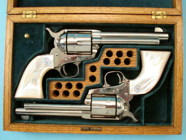 Cased and Matched Pair of Colt Single Action Post World War II Revolvers with Pearl