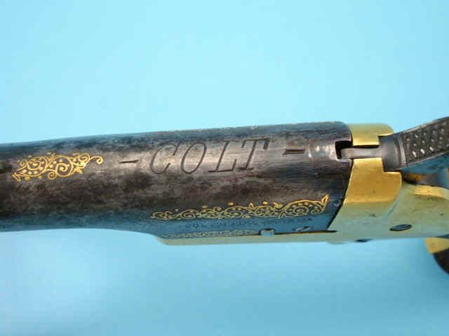 gold-inlaid floral scrolls. Left side of barrel with address reading: Colt's Firearms