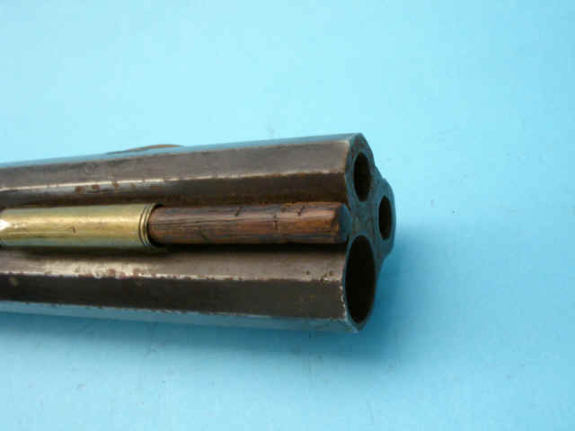 Side by side .32 caliber octagonal barrels with a 20 gauge shotgun barrel beneath.