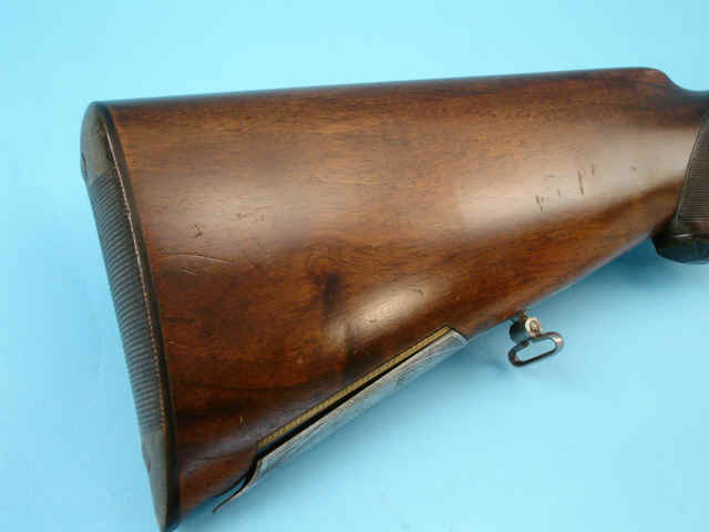 Greener-style side safety. Side clips. Finely checkered pistolgrip stock of slightly