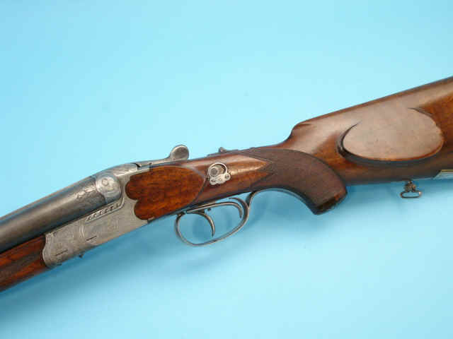 Serial no. 476. 16 x 16 gauge by 9.3x72R. 27-inch barrels with matted flat rib with
