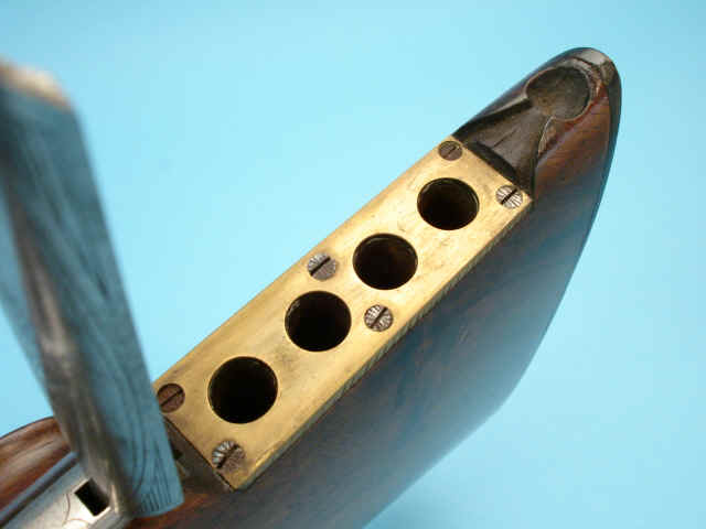 figured walnut. Horn grip cap and buttplate. Cheekpiece. Cartridge trap with hinged lid in