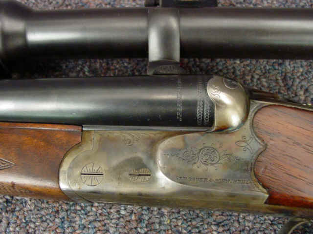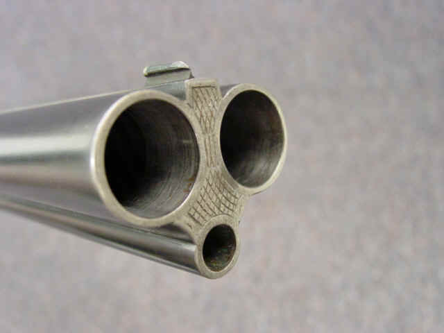 set trigger for bottom center rifle barrel; sling swivels. Firing indicators on top of
