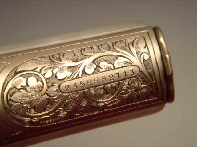 scroll engraving. Matte silver finish. Gold-plated trigger. Faux pearl grips.