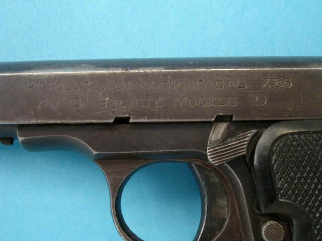Serial no. 85129, 7.65mm, 4-inch barrel. Blued finish. Checkered black plastic grips.