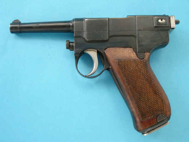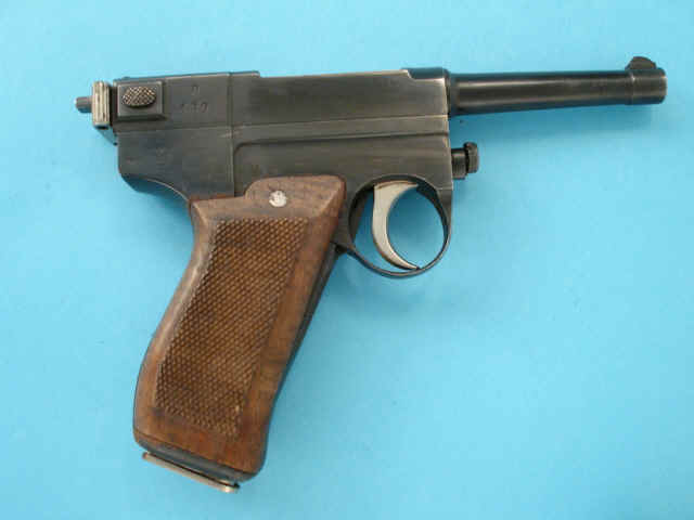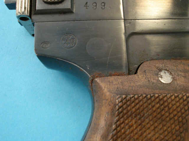 Serial no. 499, 9mm Glisenti caliber, 3 3/4-inch barrel. Blued finish. Checkered walnut