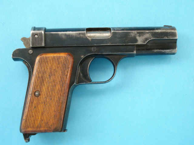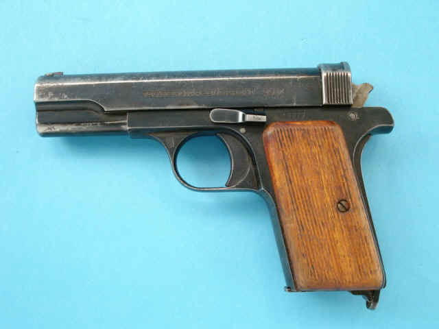 Serial no. 2887, 9mm Kurz caliber, 4-inch barrel. Blued finish. Grooved walnut grips.