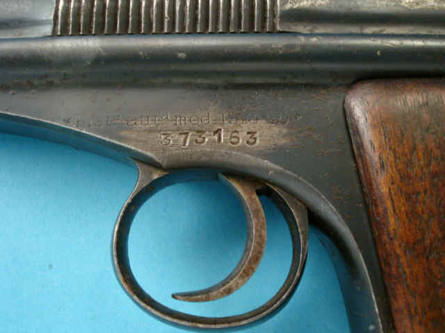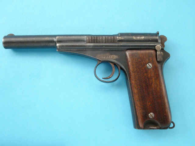 Serial no. 373163, 9mm largo [Bergmann], 6 1/4-inch barrel. Blued finish. Walnut grips.