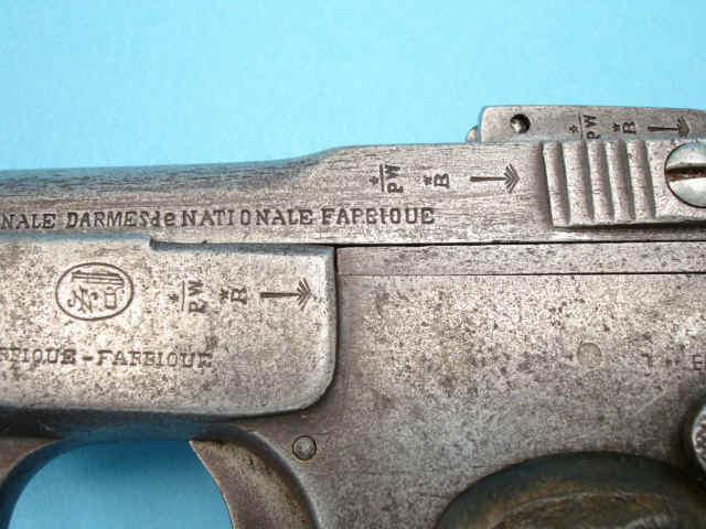 Lot 232 Detail Fabrique Nationale Model 1900 Semi-Automatic Pistol Serial no. 126053, 7.65mm, 4-inch barrel. Hard rubber grips. Lanyard loop. Condition: Fair. Grey metal with scattered pitting overall. Grips with heavy wear. Estimate: $100 - $150