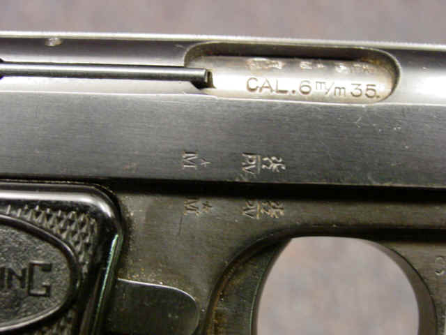 Serial no. 219248, 6.35mm caliber, 2-inch barrel, blued finish; checkered black composition grips.