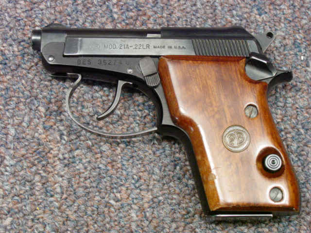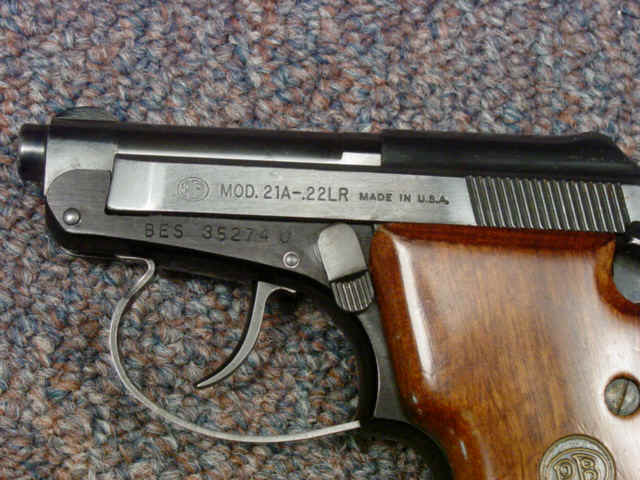 Lot 411 Detail Beretta Model 21A Semi-Automatic Pistol Serial no. BES 35274 U, .22 long rifle caliber, 2 1/2-inch barrel, blued finish; wood grips. Condition: Fine; light wear and storage marks. Estimate: $200 - $300 DVD Beretta: How to Shoot Starring: Bill Wilson Director: Lenny Magill Click here for more info Downloadable E-book Full-Auto Conversion For Browning Pistols Click here to download The World of Beretta: An International Legend by R. L. Wilson Click here for more info Gun Digest Book Of Beretta Pistols by Massad F. Ayoob Click here for more info