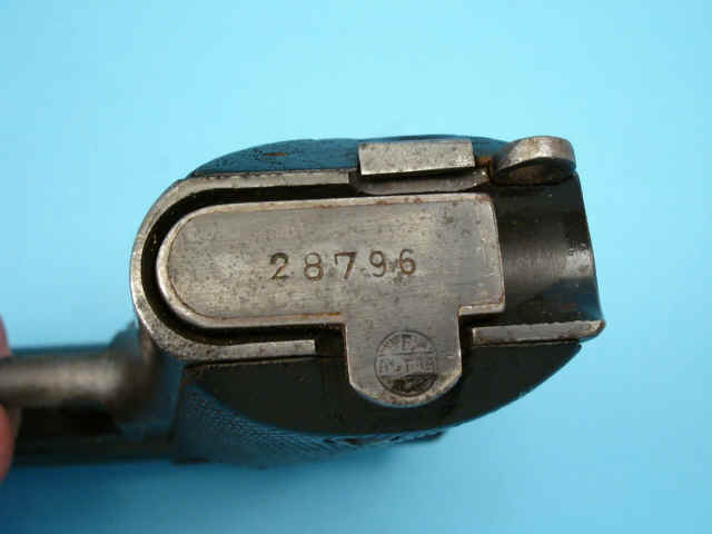 Serial no. 28796, 9mm, 5 1/4-inch barrel. 1943 dated. Blued finish. Checkered walnut