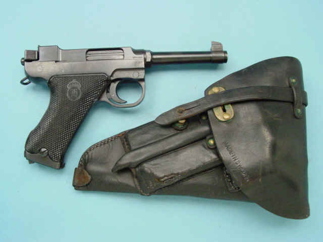 Contained in original black leather holster with two extra magazines and cleaning tools.