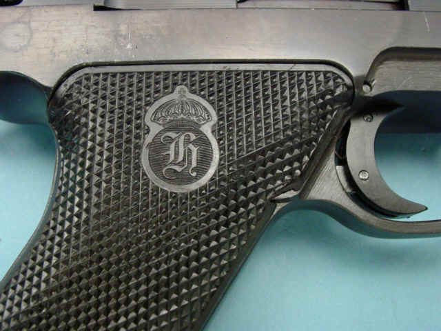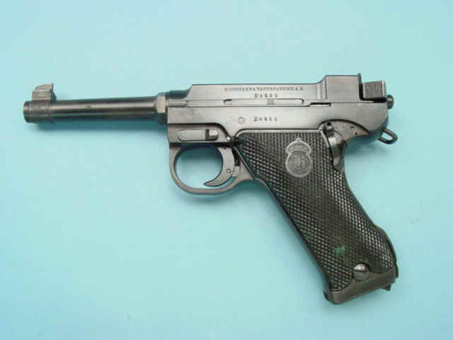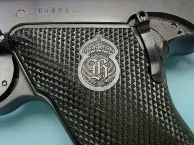 Serial no. D9485, 9mm, 4 5/8-inch barrel. Blued finish. Checkered black plastic grips.