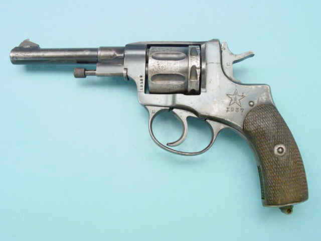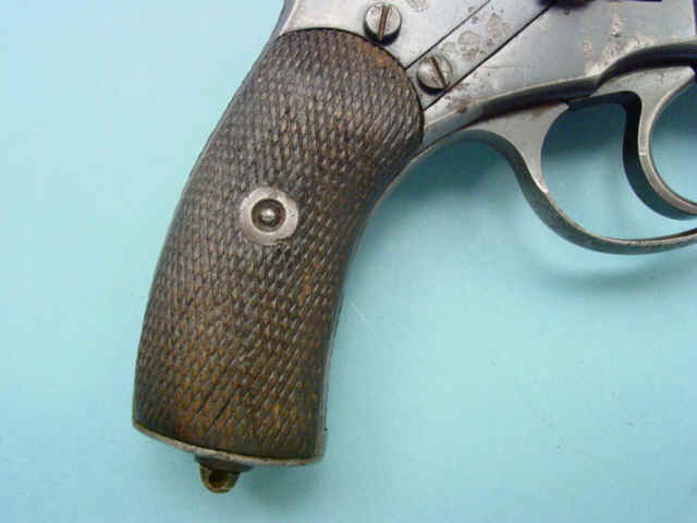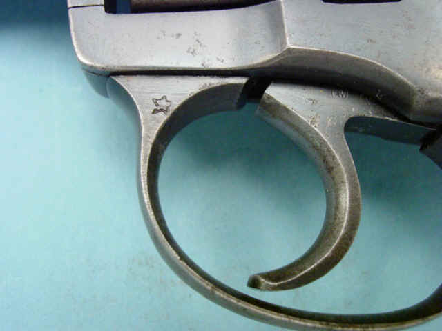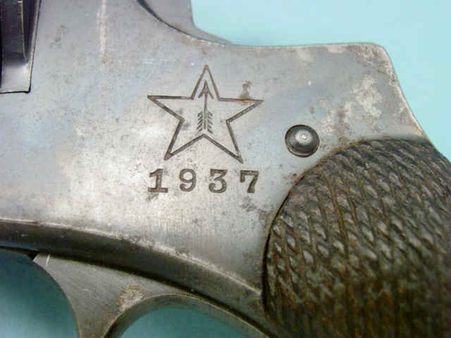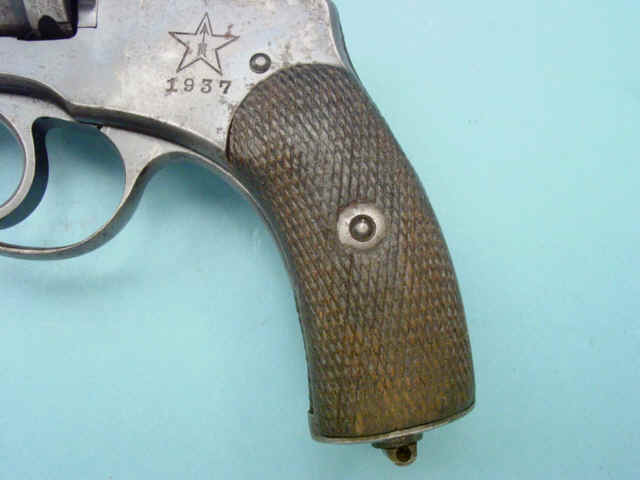 checkered walnut grips with stud for lanyard ring on butt. Star over 1937 on left side of