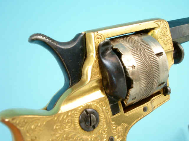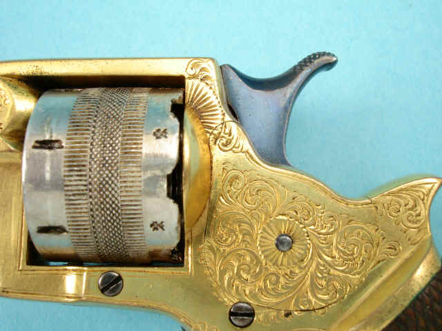 blued, with engraved and gold-plated brass frame and buttcap; nickel-plated cylinder;