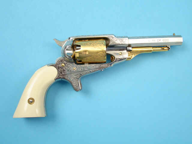 Pocket Percussion Revolver. Unserialized. Nickel and gold-plated finish. Scroll-engraved.