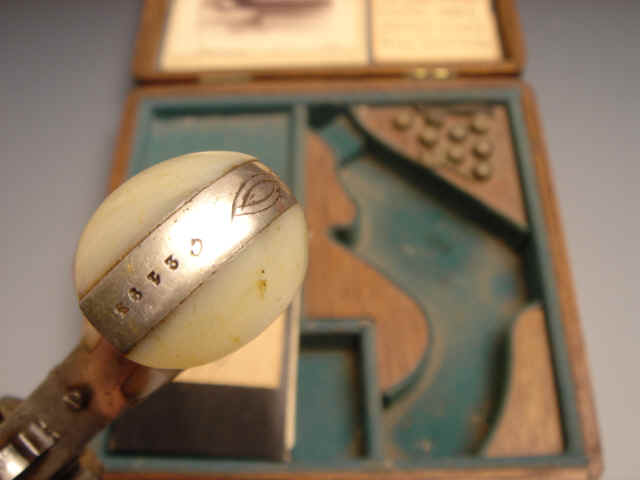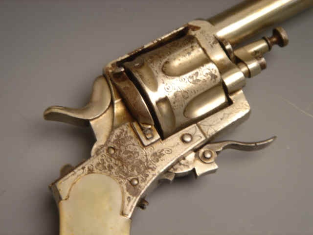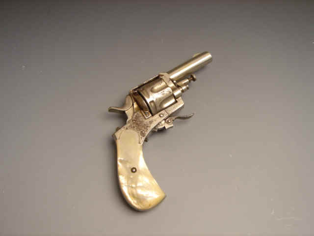 cylinder and frame. Folding trigger. Pearl grips. Contained in associated mahogany casing