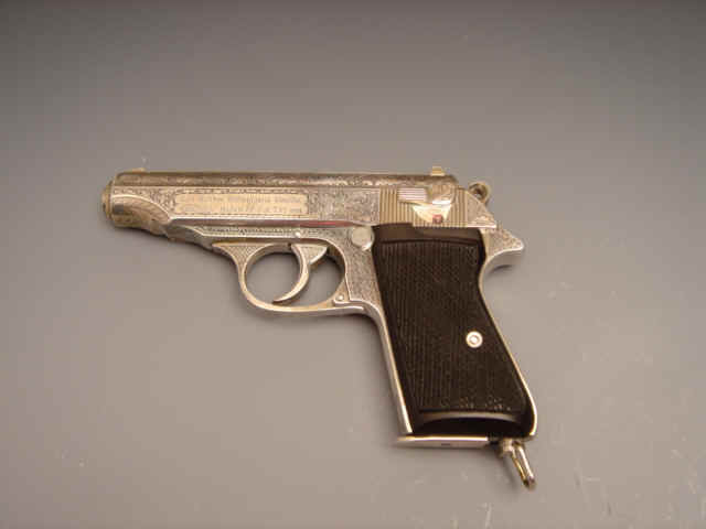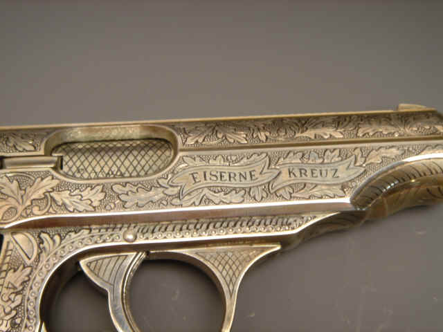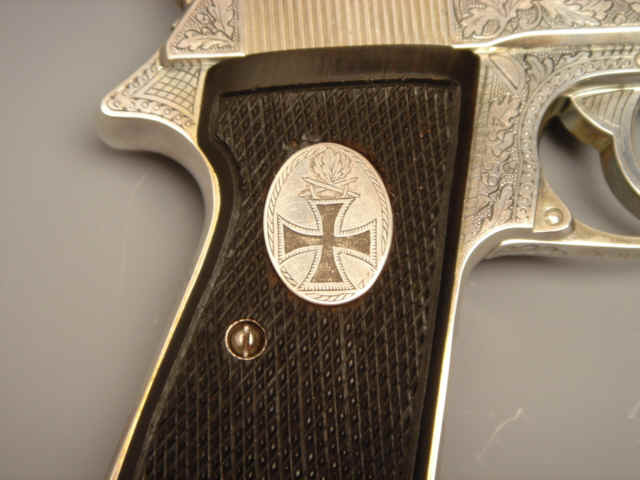 banner-engraved with EISERNE KREUZ. Right grip panel with silver oval commerative